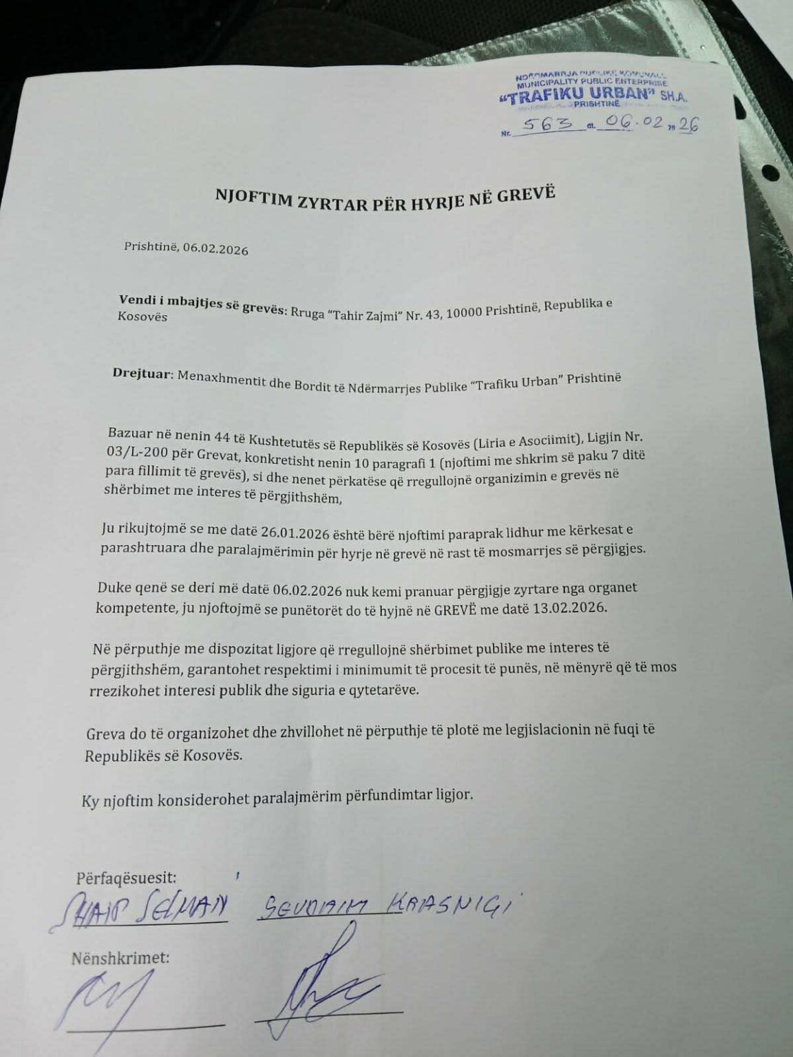 Punëtorët e ndërmarrjes publike “Trafiku Urban” në Prishtinë kanë paralajmëruar nisjen e një greve që do të fillojë më 13 shkurt 2026, në mungesë të përgjigjes zyrtare ndaj kërkesave të tyre, transmeton IndeksOnline.