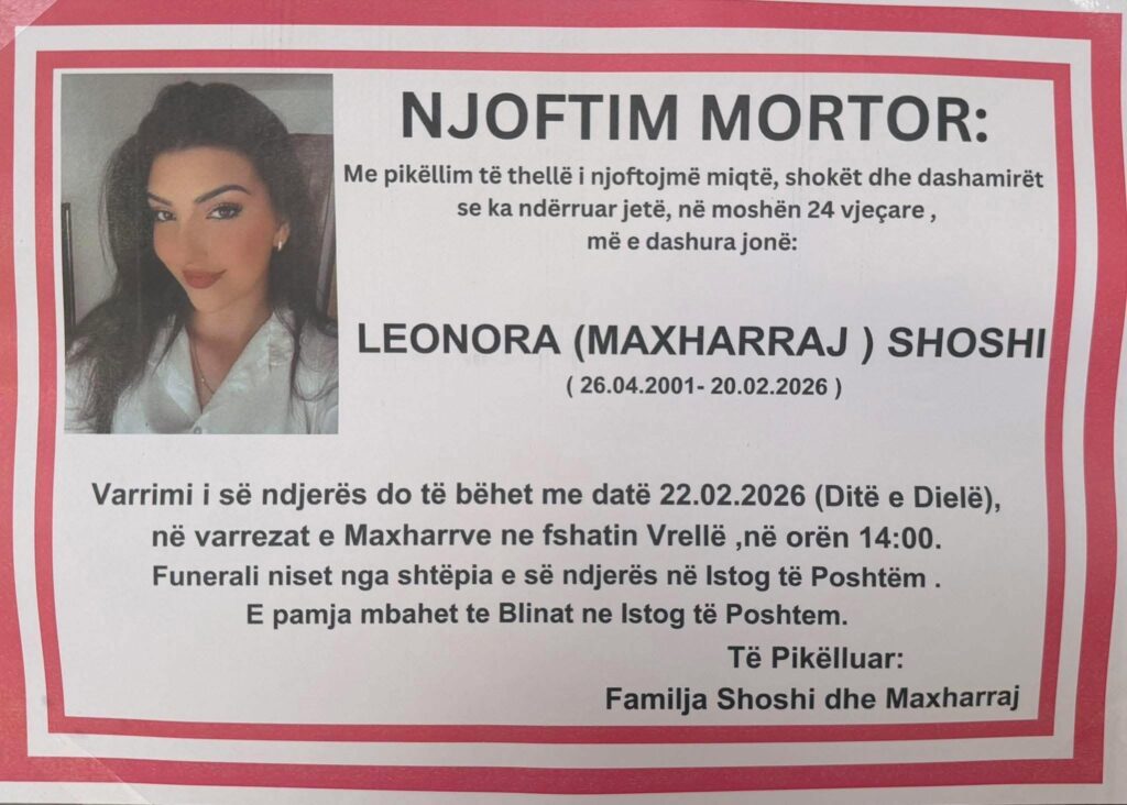 Varrimi i të ndjerës do të bëhet nesër, më 22 shkurt 2026, në varrezat e Maxharrave në fshatin Vrellë, me fillim në ora 14:00.