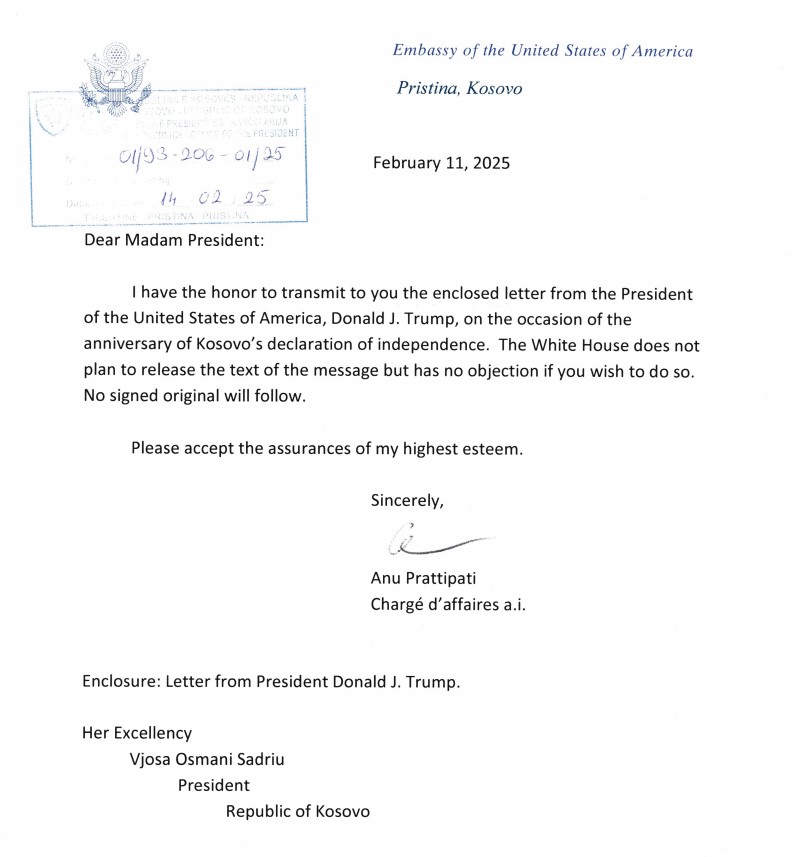 Presidentja e Republikës së Kosovës, Vjosa Osmani ka pranuar letër urimi nga Presidenti i Shteteve të Bashkuara të Amerikës, Donald J. Trump, me rastin e 17-vjetorit të shpalljes së Pavarësisë së Kosovës.