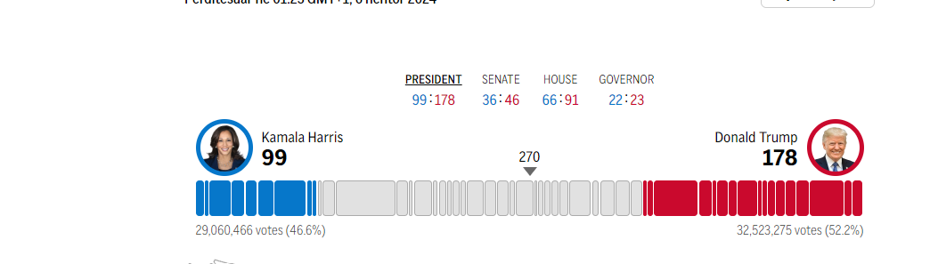Përkthyer në vota, Trump fitoi 178 vota të Kolegjit Zgjedhor, kurse Harris 99, raporton AP.