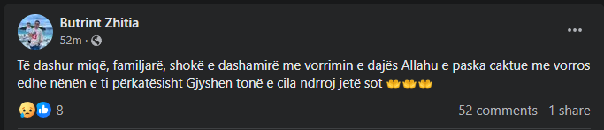 “Të dashur miq, familjarë, shokë e dashamirë me varrimin e dajës Allahu e paska caktu me varros edhe nënën e ti, përkatësisht gjyshen tonë e cila ndërroj jetë sot“, ka shkruar familjari i dy të ndjerëve, Butrint Zhitia.