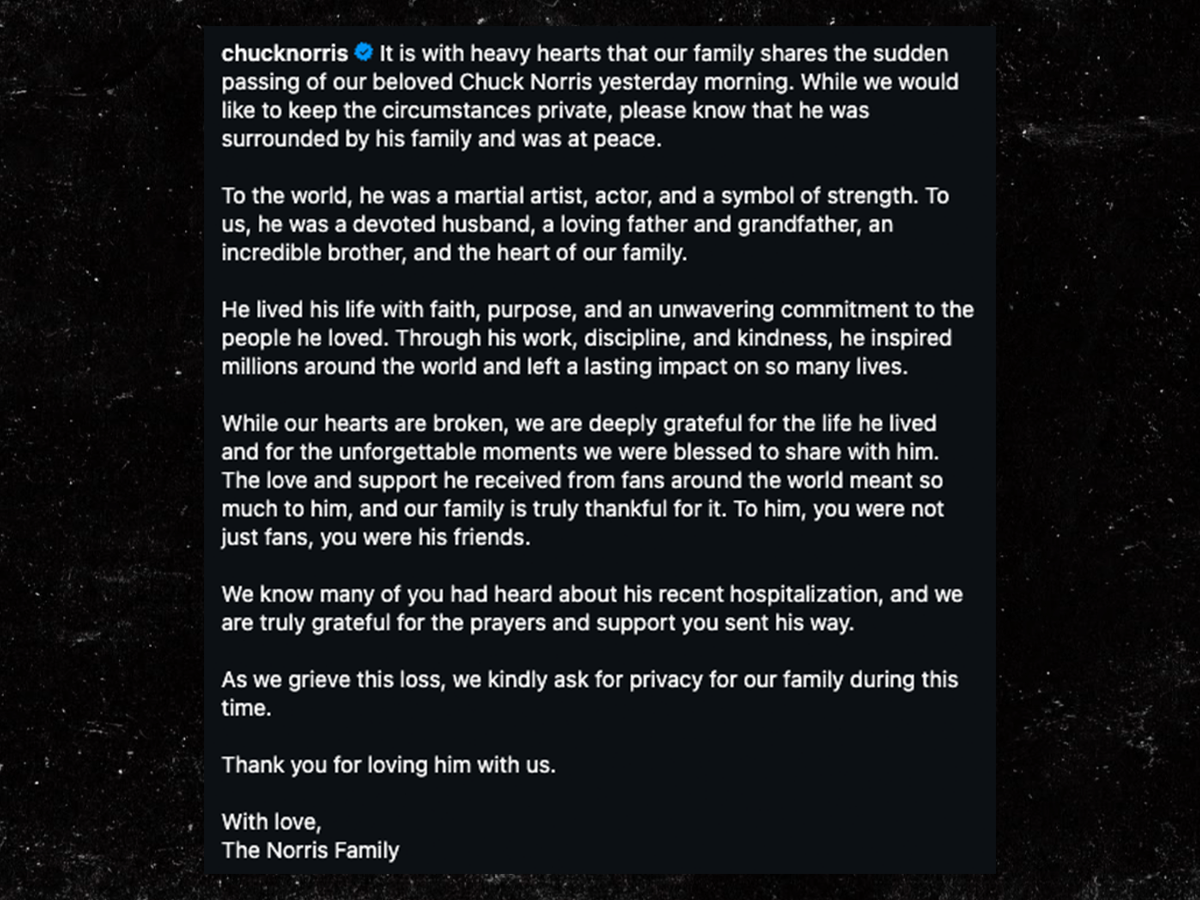 Postimi thotë… “Me zemër të thyer familja jonë ndan lajmin e ndarjes së papritur nga jeta të të dashurit tonë Chuck Norris dje në mëngjes. Ndërsa dëshirojmë t’i mbajmë rrethanat private, ju lutemi ta dini se ai ishte i rrethuar nga familja e tij dhe në paqe.”
