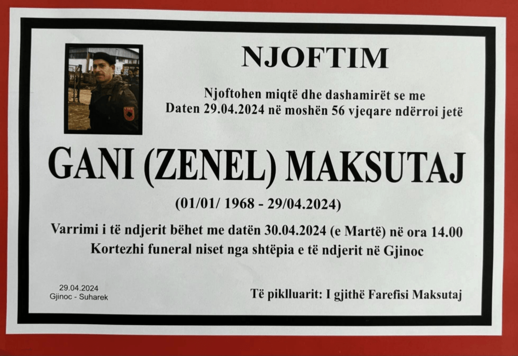 Në moshën 56-vjeçare ka vdekur veterani i Ushtrisë Çlirimtare të Kosovës, Gani Maksutaj.