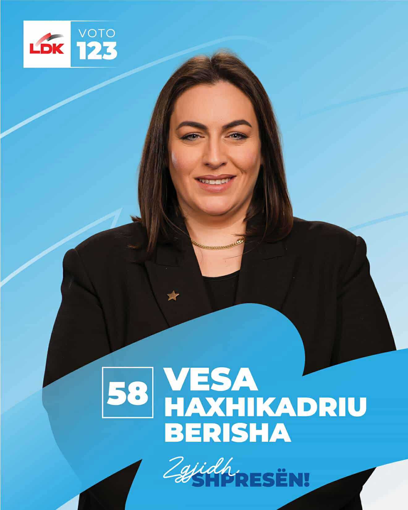 Me numrin 58, Vesa Haxhikadriu-Berisha futet në politikë me një listë premtimesh që synojnë grupet më të ndjeshme të shoqërisë: fëmijët, të moshuarit, gratë e vajzat, nënat vetushqyese, personat me nevoja të veçanta, familjet e fëmijëve me autizëm dhe komunitetet pakicë. Si specialiste e edukimit dhe hulumtuese e kurrikulave, ajo zoton të shtyjë përpara rishikimin e kurrikulës dhe integrimin e kompetencës digjitale për inovacion tek nxënësit.