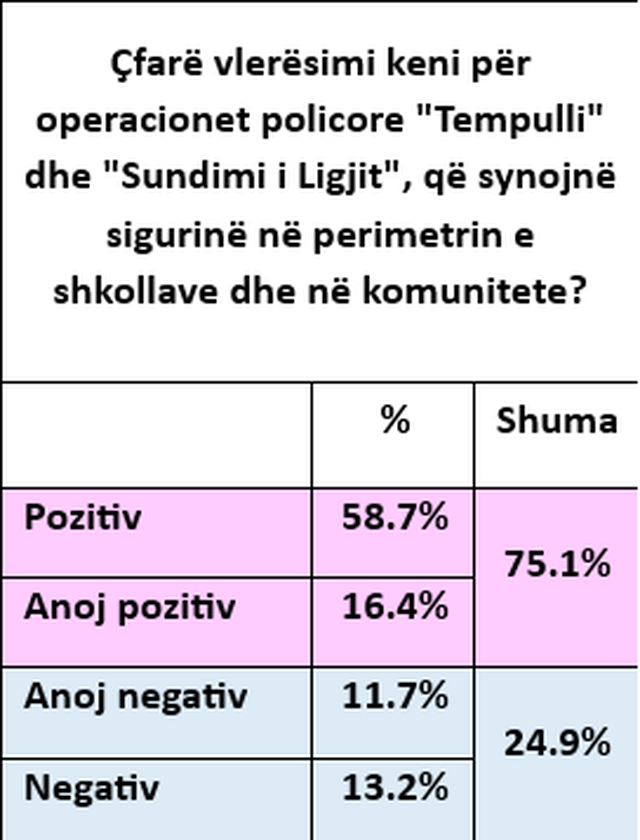 Nga Barometri i opinionit për policinë që zhvillova në dhjetor për Institutin Agenda, rezultoi se rreth 75.1% e të anketuarve anojnë nga vlerësimi pozitiv për operacionet policore “Tempulli” dhe “Sundimi i Ligjit” – 58.7% pozitiv dhe 16.4% anojnë pozitiv (shihni Tabelën 1). Nga një ekstrapolim i përafërt, rezulton se rreth 1.54 milionë banorë të rritur gjithsej anojnë nga vlerësimi pozitiv.