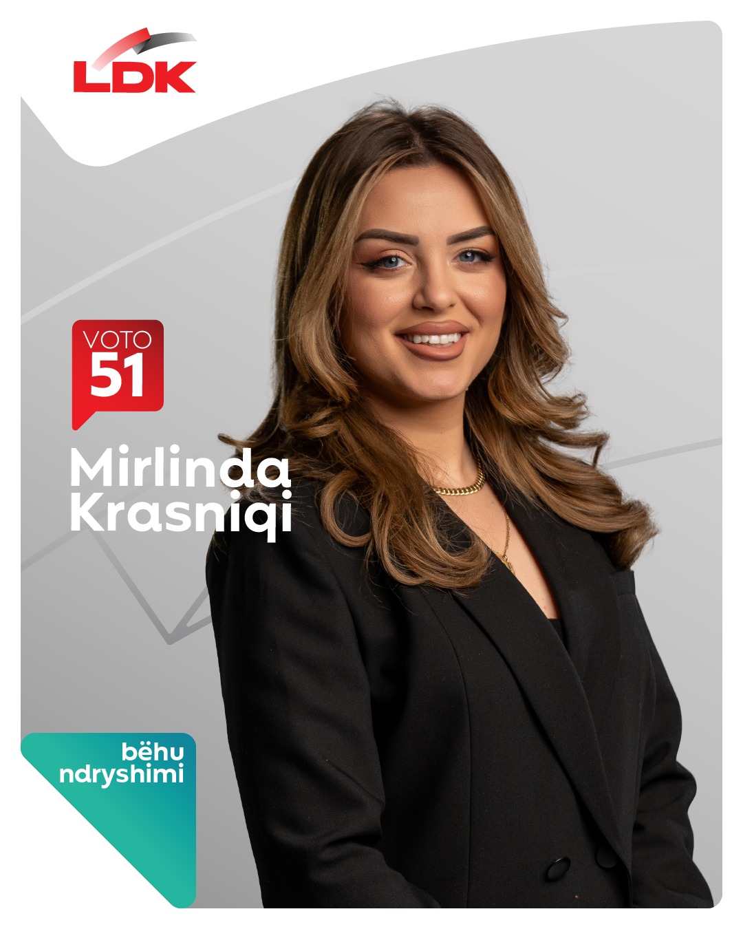 Në këto zgjedhje, votojeni Mirlinda Krasniqi, deputeten e angazhuar të Lidhjes Demokratike të Kosovës (LDK), me numrin 51! Mirlinda është një lider e dedikuar, e cila ka treguar përkushtim dhe angazhim të palodhur për përmirësimin e kushteve të jetesës në Kosovë. Me një vizion të qartë dhe një qasje të përgjegjshme, ajo do të vazhdojë të mbrojë interesat e qytetarëve dhe të kontribuojë në zhvillimin e mëtejshëm të vendit.