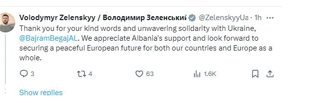 Ai reagoi në platformën X ndaj mesazhit të presidentit, Bajram Begaj, i cili përmes një postimirikonfirmoi mbështetjen e Shqipërisë ndaj popullit ukrainas, në dyvjetorin e luftës me Rusinë.