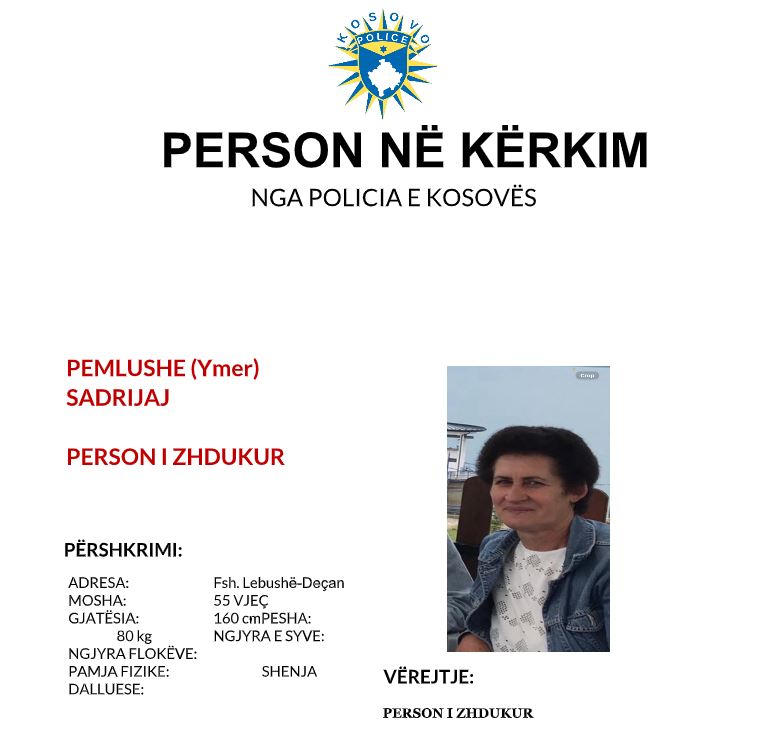Policia e Kosovës ka njoftuar se një 55-vjeçare, Pemlushe Sadrijaj është zhdukur në Rahovec, dhe njëkohësisht po kërkon ndihmën e qytetarëve për të lokalizuar vendndodhjen e saj.