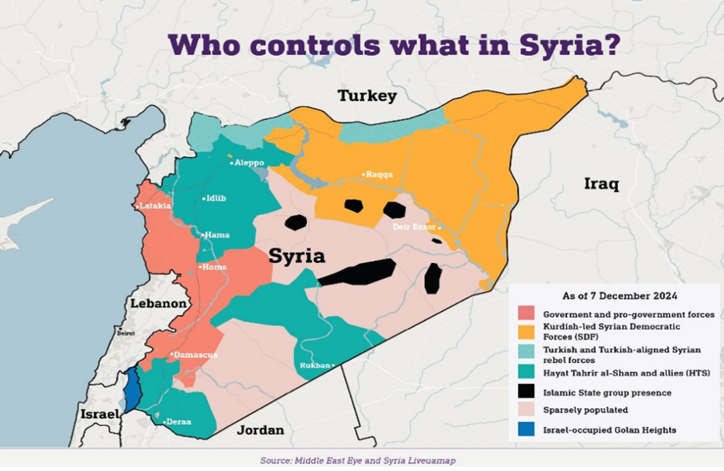 Hay’atTahriral-Sham (HTS), një koalicion i grupeve sunite, ka kaluar transformime të rëndësishme në vitet e fundit. Dikur degë e Frontit al-Nusra, degë eal-Kaidës, HTS është distancuar nga origjina e saj. Grupi është rikonstruktuar dhe promovon një vizion për një shtet me institucione që respektojnë diversitetin etnik dhe fetar. Kjo qasje e re ka nxitur diskutime në Shtetet e Bashkuara për mundësinë e heqjes së HTS-së nga lista e organizatave terroriste. Aktualisht, HTS udhëheq një betejë vendimtare kundër forcave të Asadit, duke synuar përfitime territoriale dhe politike deri në kryeqytetin Damasku.