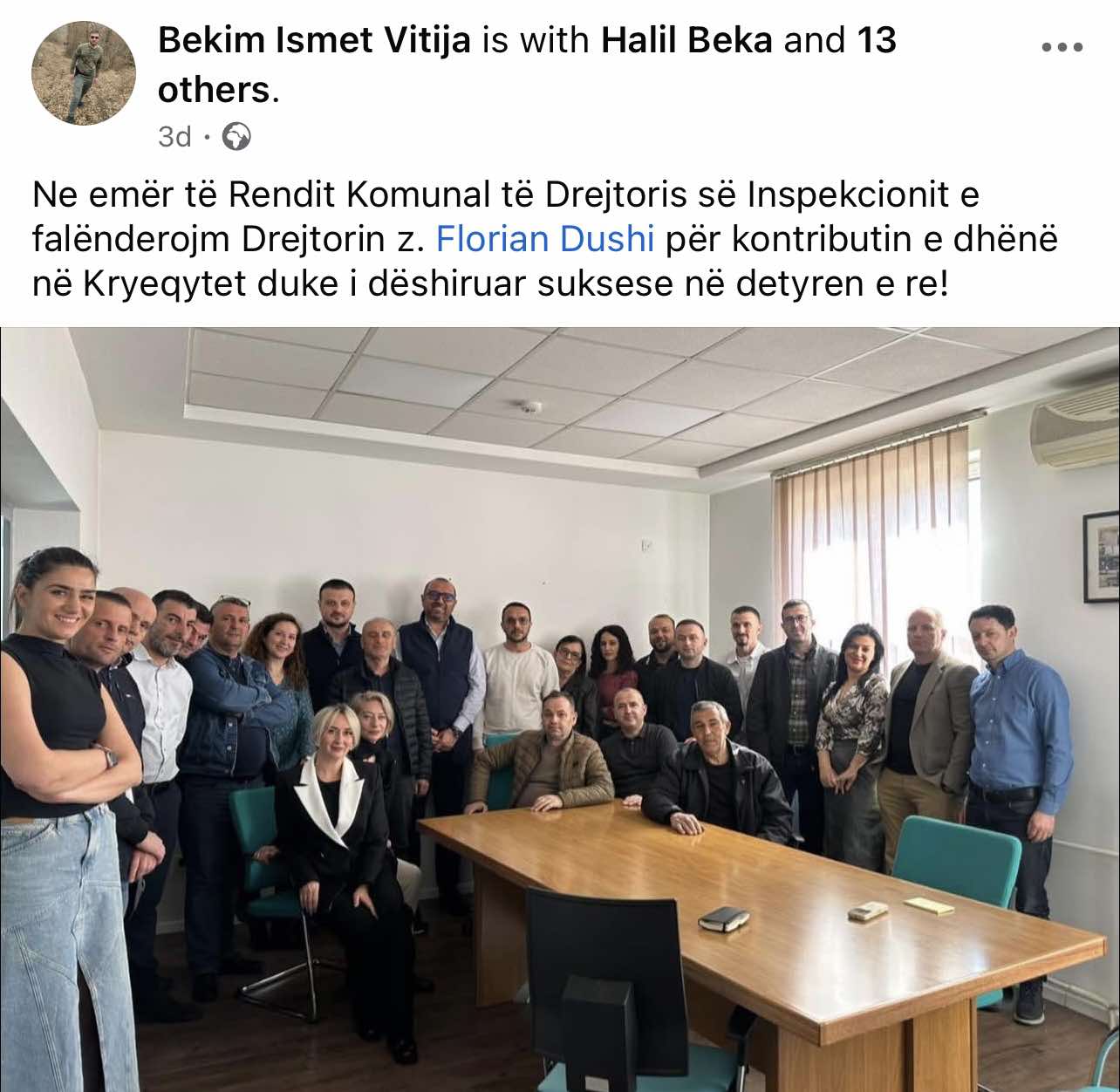 “Ne emër të Rendit Komunal të Drejtorisë së Inspekcionit e falënderojmë Drejtorin z. Florian Dushi për kontributin e dhënë në Kryeqytet duke i dëshiruar suksese në detyrën e re!”